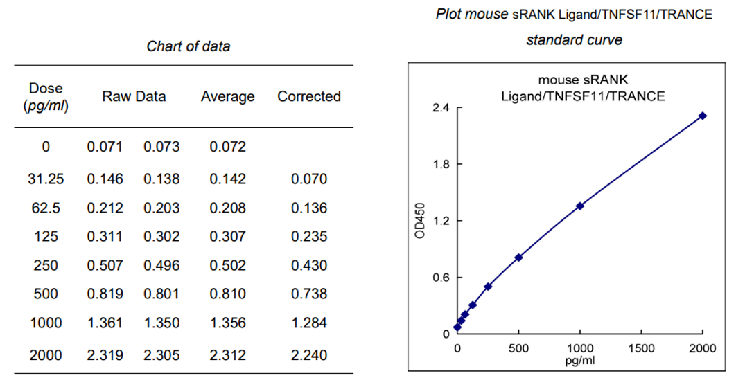 注意:本图仅供参考,应以同次试验标准品所绘标准曲线计算标本中小鼠sRANK Ligand/TNFSF11/TRANCE的含量。