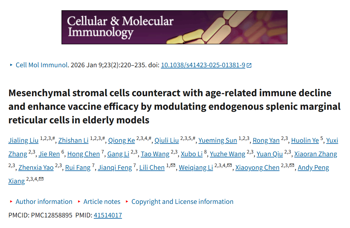 Jialing Liu, Zhishan L, Qiong Ke,, et al. Mesenchymal stromal cells counteract with age-related immune decline and enhance vaccine efficacy by modulating endogenous splenic marginal reticular cells in elderly models. Cellular & Molecular Immunology. 2026 Feb;23(2):220-235.
